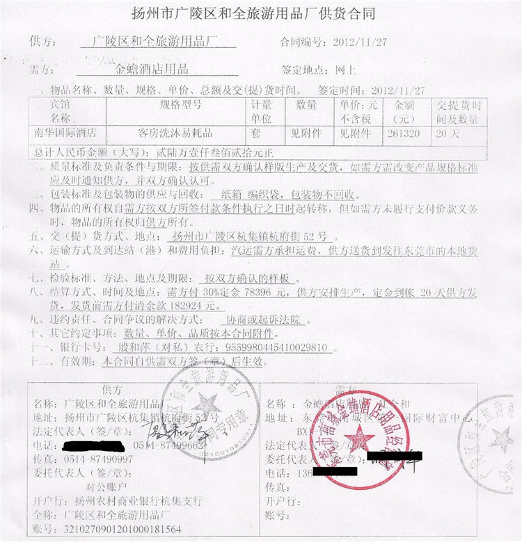 至此東莞南華國(guó)際酒店交易完成,雙方都非常滿意,揚(yáng)州市廣陵區(qū)和全旅游用品廠會(huì)在高端酒店用品市場(chǎng)會(huì)越走越好,以價(jià)格、質(zhì)量、交貨期為前提,讓客戶滿意。